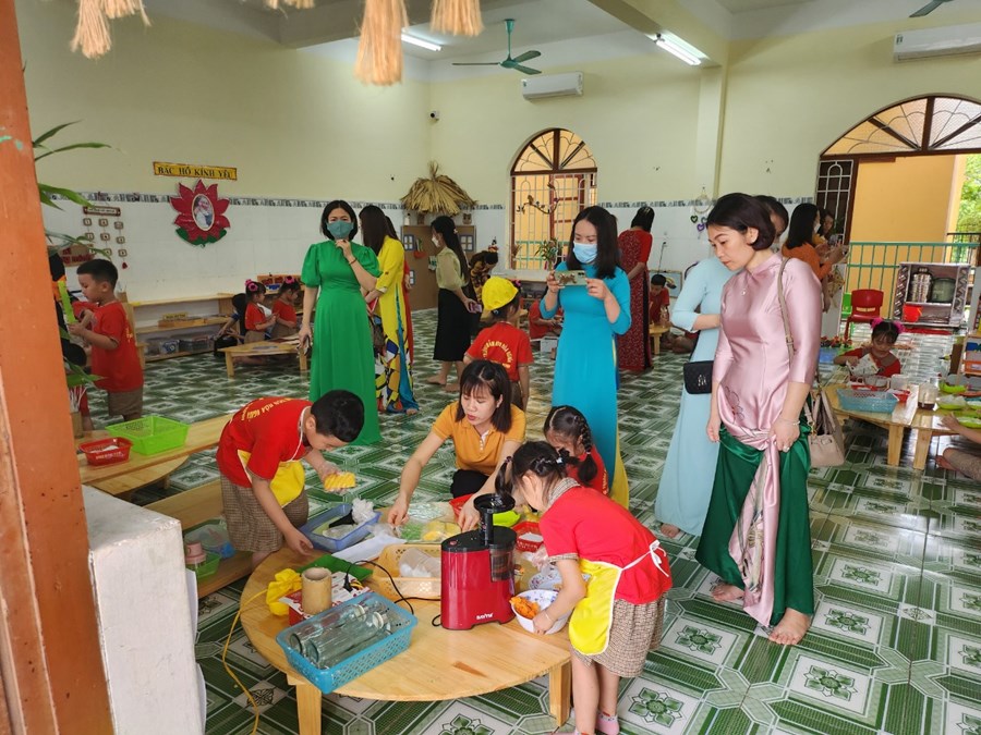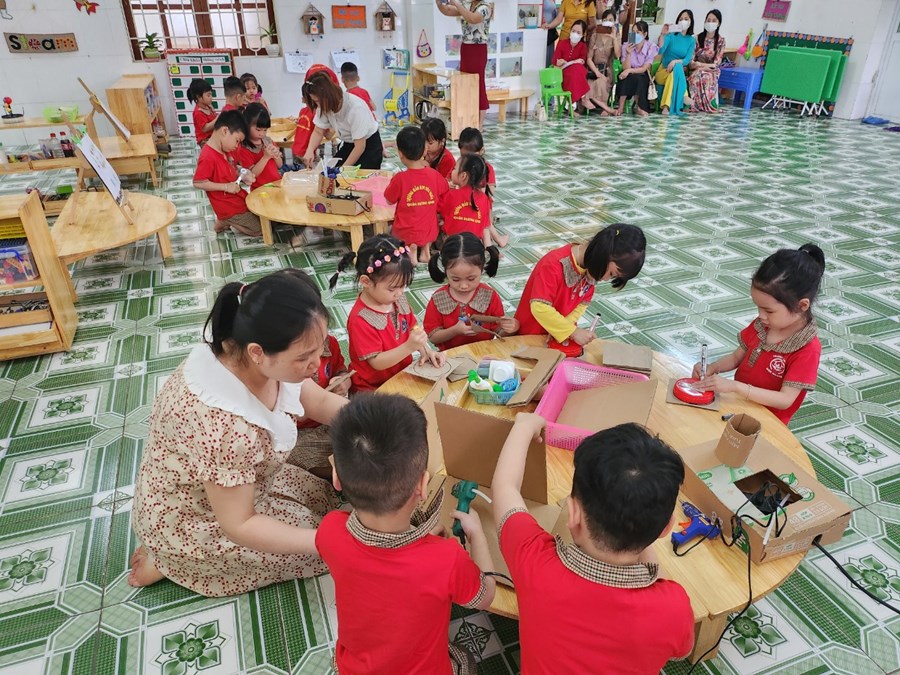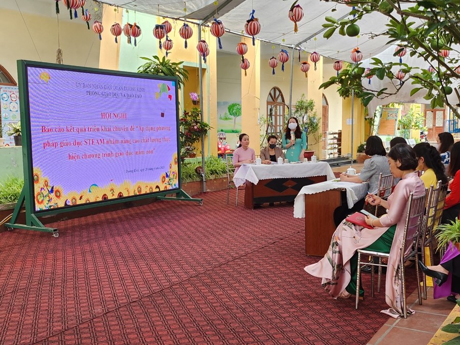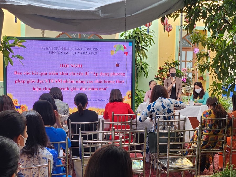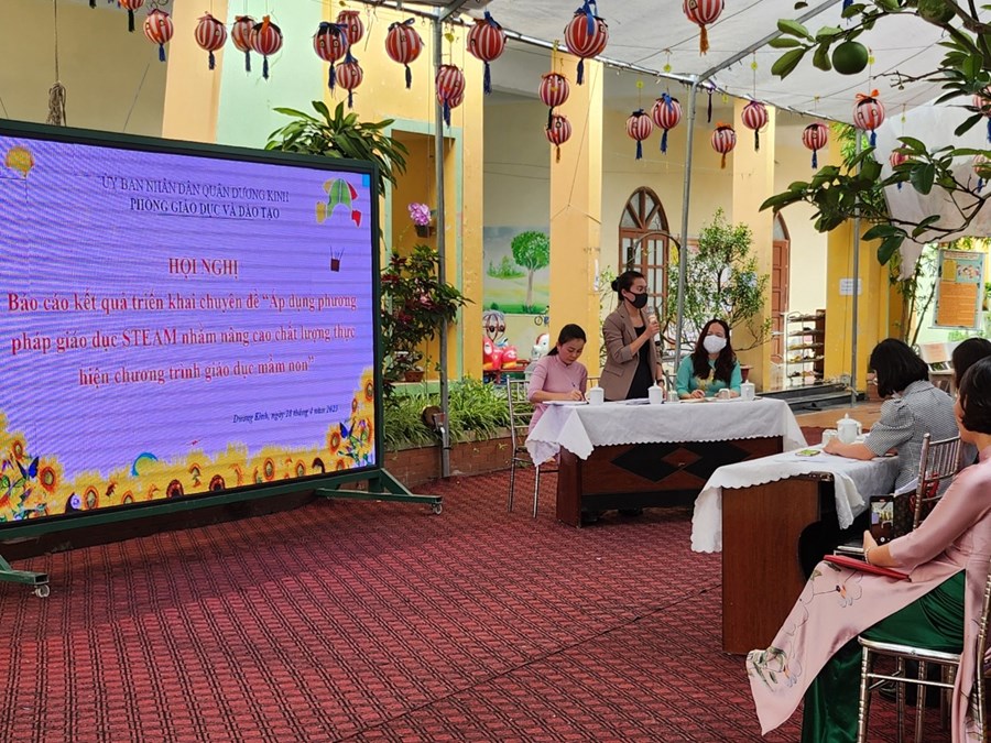Ngày 28/4/2023 Phòng Giáo dục và Đào tạo quận Dương Kinh tổ chức báo cáo chuyên đề "Áp dụng phương pháp giáo dục STEAM nhằm nâng cao chất lượng thực hiện chương trình giáo dục mầm non" tại trường mầm non Hòa Nghĩa. Hội nghị báo Vinh dự được đón tiếp các đồng chí lãnh đạo, chuyên viên Phòng Giáo dục mầm non Sở Giáo dục Đào tạo Hải Phòng, các đồng chí lãnh đạo Ban tuyên giáo Quận ủy; các đồng chí lãnh đạo chuyên viên Phòng Giáo dục và Đào tạo quận. Hội nghị báo cáo diễn ra với các nội dung: Trưng bày sản phẩm STEAM của trẻ; hệ thống giáo án STEAM, các quy trình hướng dẫn trẻ làm thí nghiệm; tổ chức sân chơi "Ai thông minh hơn học sinh mầm non; tổ chức 3 hoạt động: Khám phá nguyên vật liệu làm máy chiếu bóng của các con 5 tuổi, làm xe chở hàng của các con 4 tuổi, hoạt động vui chơi với dự án "làm đồ chơi với gió". Hội nghị đã thành công tốt đẹp, với tinh thần lan tỏa, chia sẻ chuyên môn về việc áp dụng phương pháp giáo dục tiên tiến.