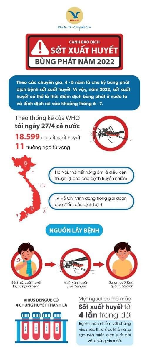 Hiện nay số ca nhập viện do sốt xuất huyết Dengue đang tăng và chưa có dấu hiệu dừng lại. Theo dự đoán của các chuyên gia, năm 2022 sốt xuất huyết có thể bùng phát thành dịch, đỉnh dịch rơi vào tuần thứ 25-26 của năm (khoảng tháng 6-7).