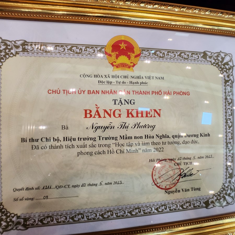 Chúc mừng đồng chí Nguyễn Thị Phương Bí thư Chi bộ - Hiệu trưởng trường mầm non Hòa Nghĩa Quận Dương Kinh đã đạt thành tích xuất sắc trong “Học tập và làm theo tư tưởng, đạo đức, phong cách Hồ Chí Minh” năm 2022.