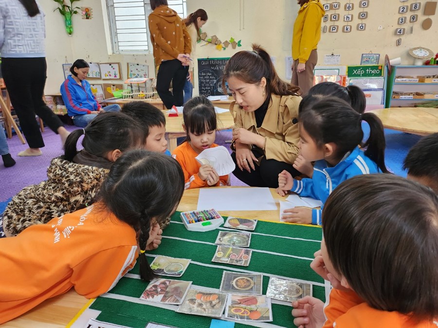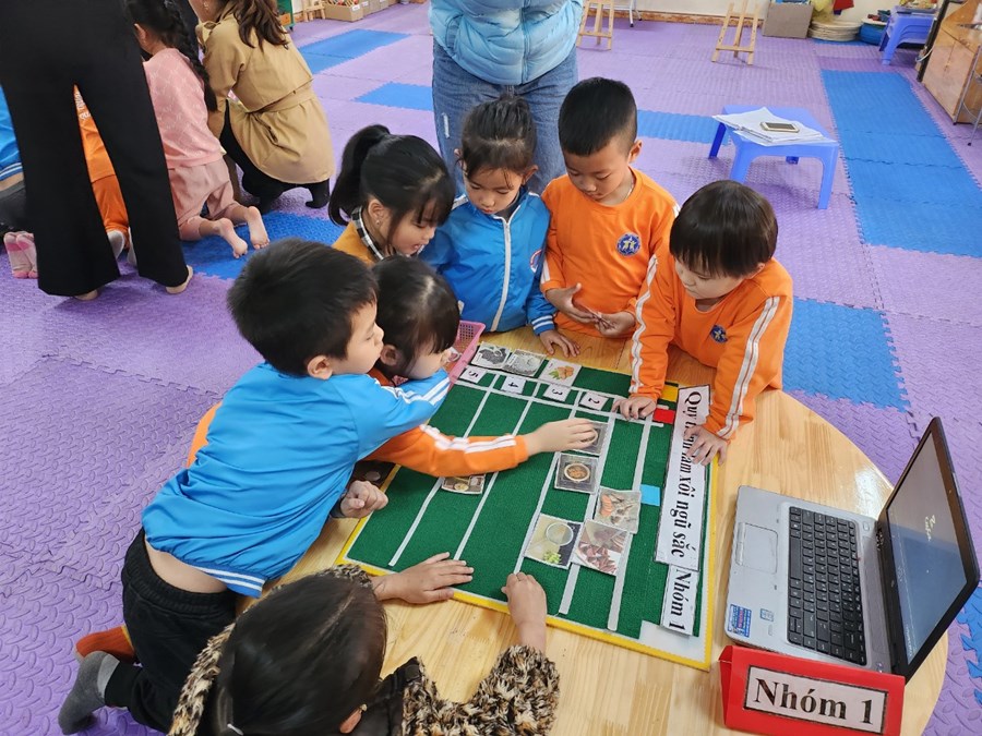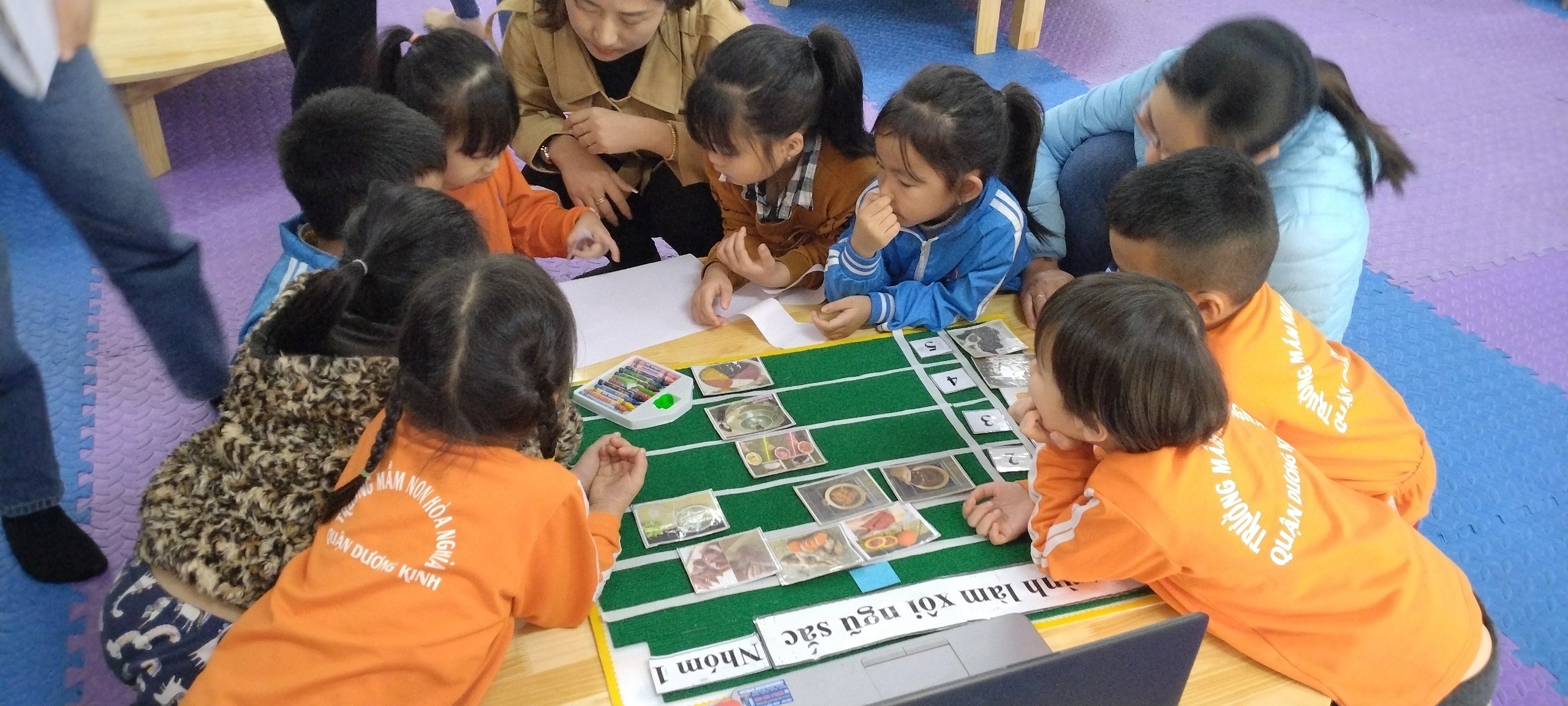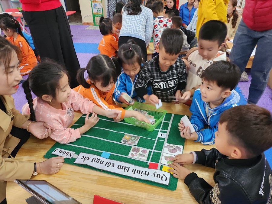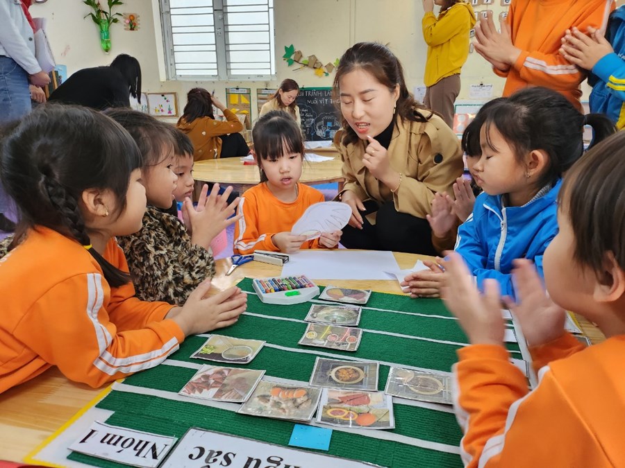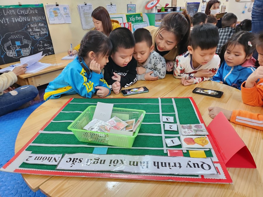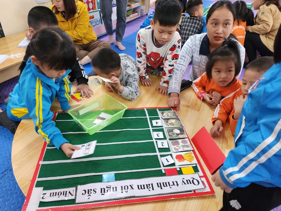 HÌnh ảnh cô và trẻ tham gia hoạt động STEAM (5E) khám phá quy trình "Làm xôi ngũ sắc" từ nguyên liệu tự nhiên