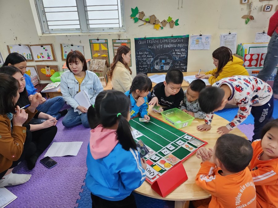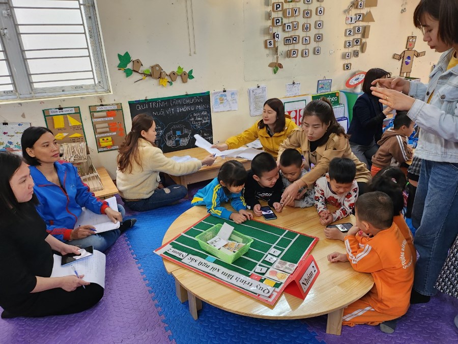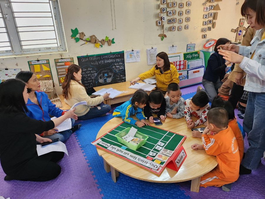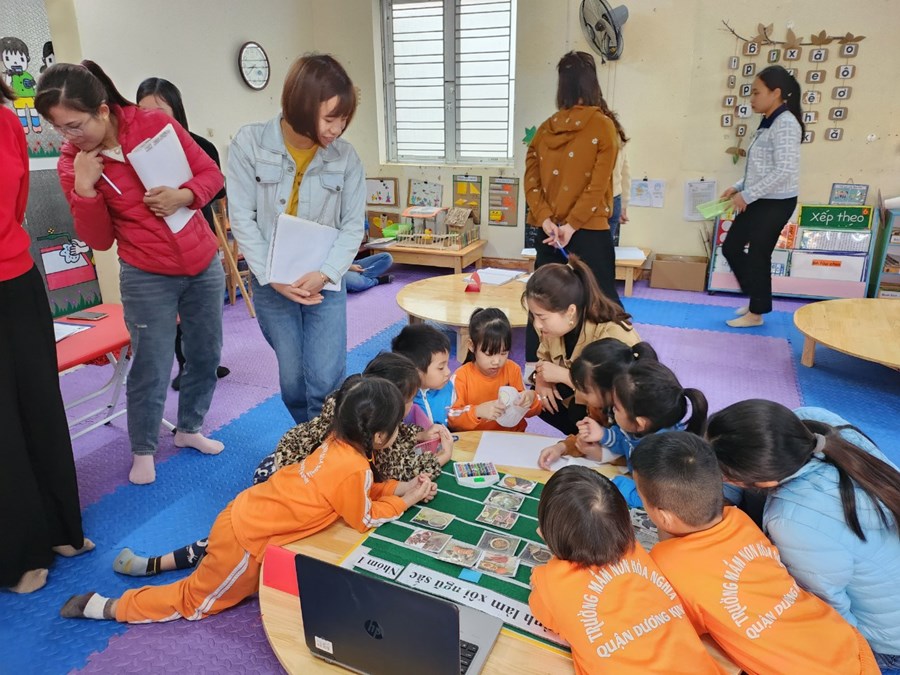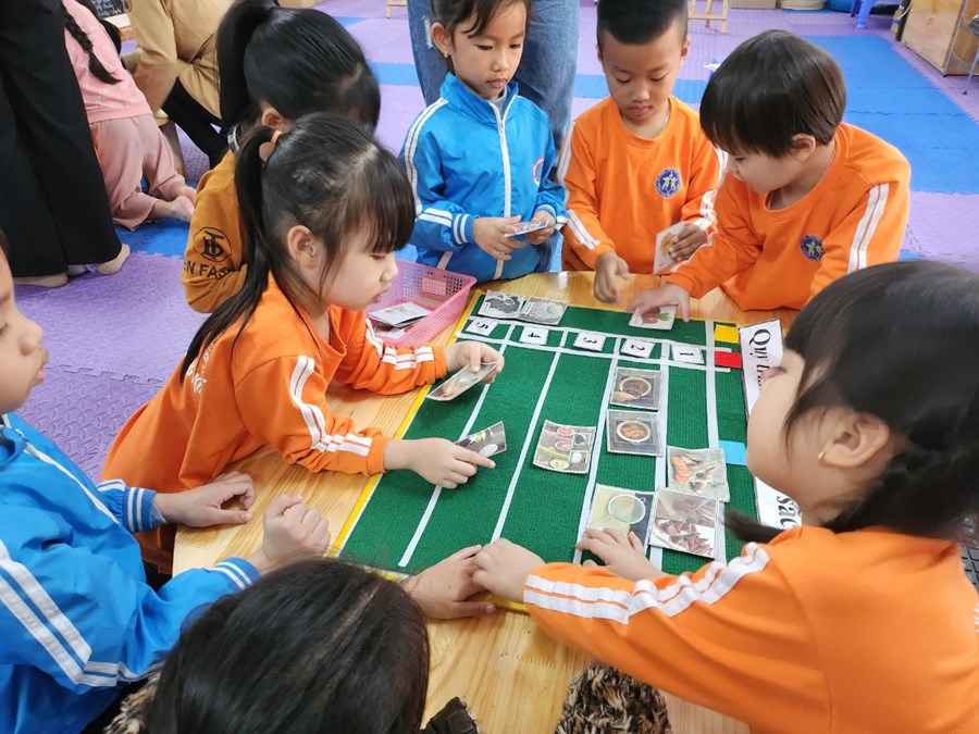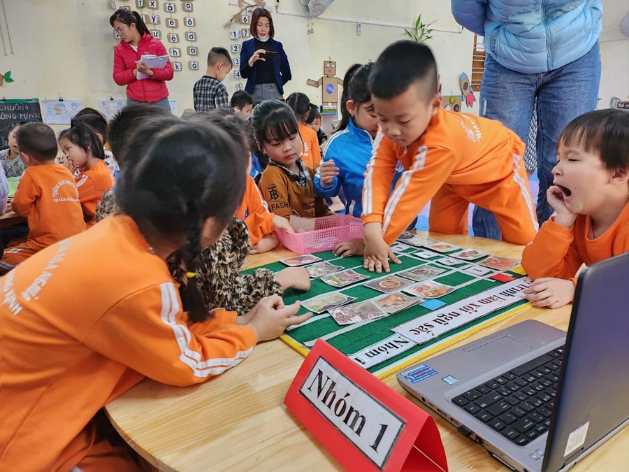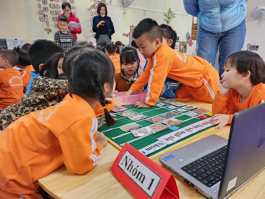 HÌnh ảnh cô và trẻ tham gia hoạt động STEAM (5E) khám phá quy trình "Làm xôi ngũ sắc" từ nguyên liệu tự nhiên