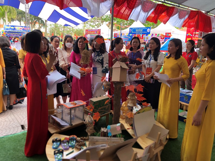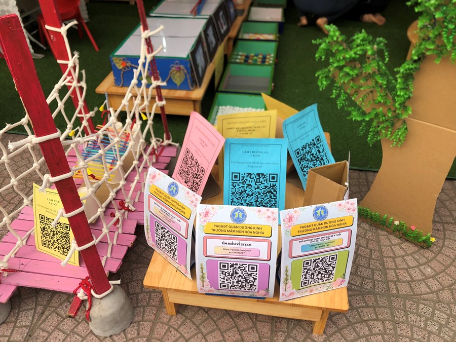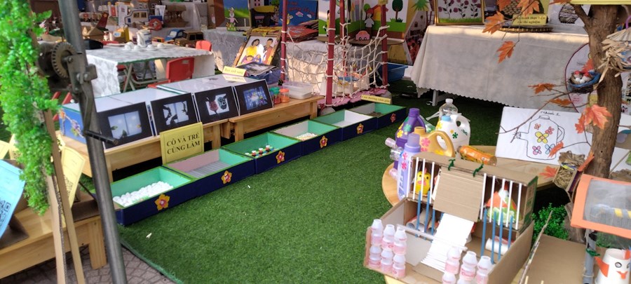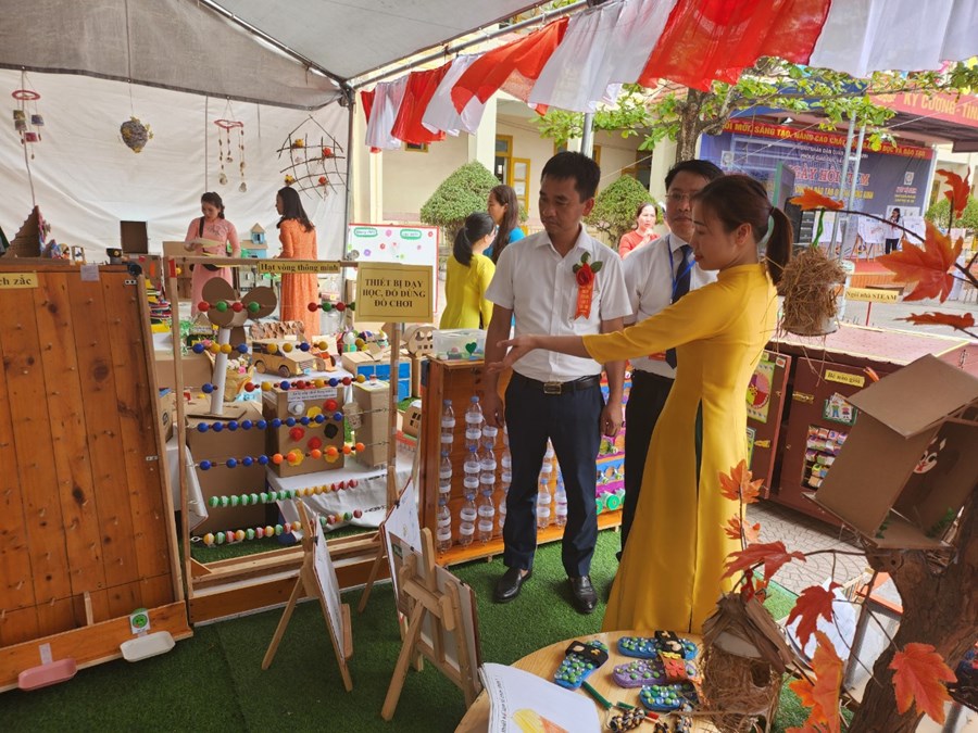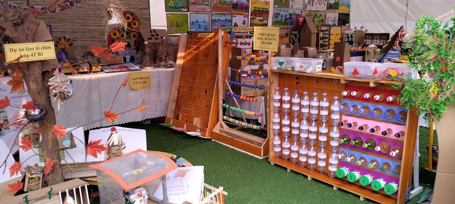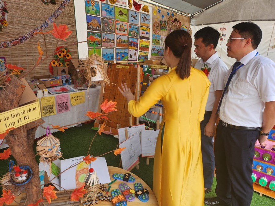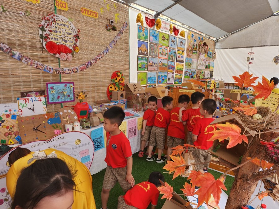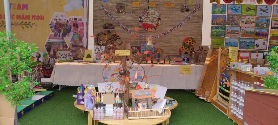 Bên cạnh đó nhà trường tham gia 01 gian trưng bày các sản phẩm STEAM của trẻ với các dự án như: Làm tổ chim, Làm đồng hồ treo tường; Làm ô tô tải; Làm chuồng gà; Làm chuồng vịt thông minh; Làm máy chiếu bóng; Làm cầu; Làm bè thuyền…; 10 thiết bị dạy học của giáo viên sáng tạo, thiết kế để phục vụ tổ chức các hoạt động STEAM cho trẻ.