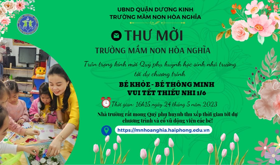 Thực hiện nhiệm vụ năm học 2022 – 2023 của Phòng Giáo dục và Đào tạo Quận Dương Kinh, Của trường MN Hòa Nghĩa. Trường mầm non Hòa Nghĩa trân trọng kính mời các quý vị đại biểu, các bậc phụ huynh tới dự “liên hoan bé khỏe, bé thông minh và vui tết thiếu nhi 1/6.